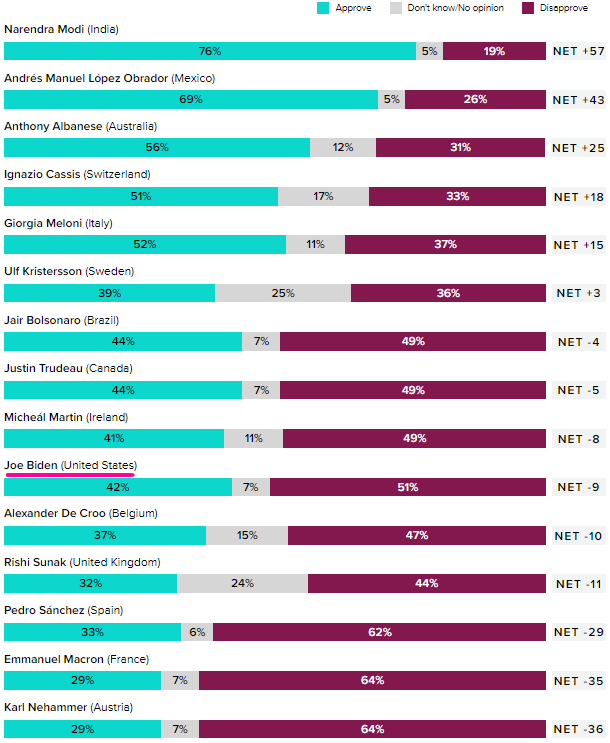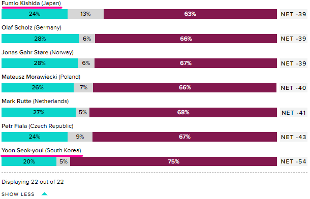 **조 바이든 긍정평가 42% 부정 평가 51%(10위) , 기시다 24%, 부정 평가 63%(16위)