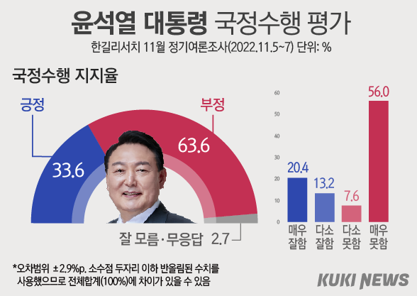 1. 윤 대통령 국정운영평가 : 부정 평가 63.6%, 긍정평가 33.6%