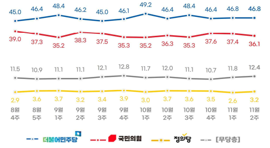 2. 정당지지도: 더불어민주당 46.8%, 국민의힘 36.1%, 정의당 3.2%, 무당층 12.4%
