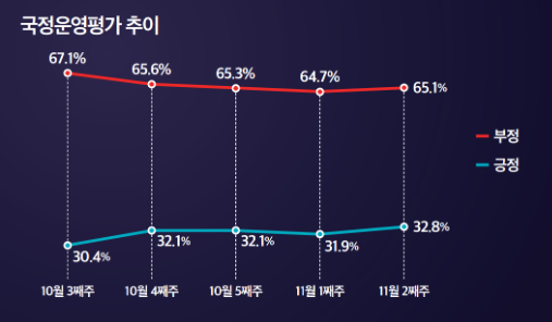 1. 윤 대통령 국정운영평가 : 부정 평가 65.1%(0.4%↑), 긍정평가 32.8%(0.9%↑)