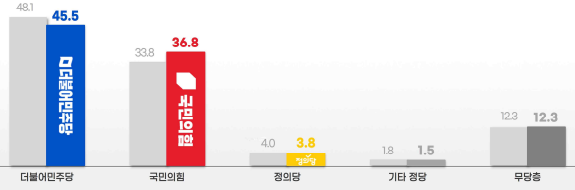 2. 정당지지도 : 더블어민주당 45.1%(4.8%↑), 국민의힘 33.6%(8.2%↓)
