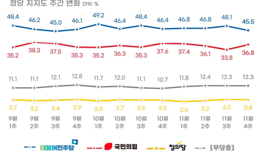 (11월 21일~25일, 만 18세 이상, 2,514명, 유무선 자동응답, 표본오차는 95% 신뢰 수준에 ±2.2%)