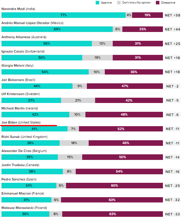 **조 바이든 긍정평가 41% 부정 평가 52%(9위) , 기시다 23%, 부정 평가 63%(18위)