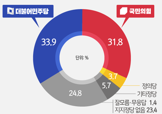 2. 정당지지도: 더불어민주당 33.9%, 국민의힘 31.8%, 정의당 3.7%