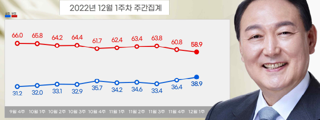 1. 윤 대통령 국정운영평가 : 부정 평가 58.9%, 긍정평가 38.9%
