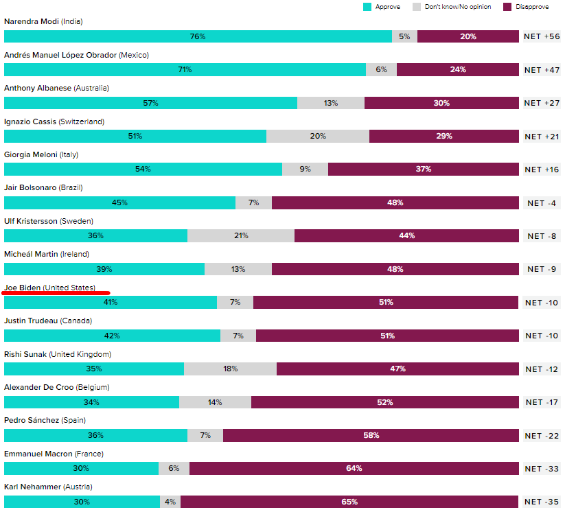 **조 바이든 긍정평가 41% 부정 평가 51%(9위) , 기시다 22%, 부정 평가 64%(19위)
