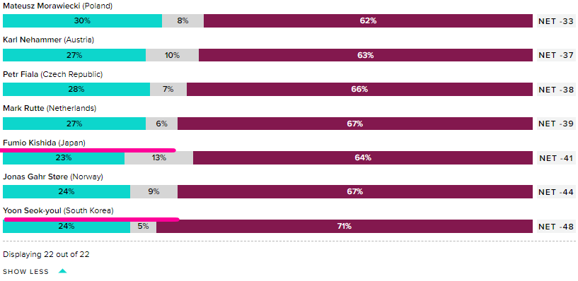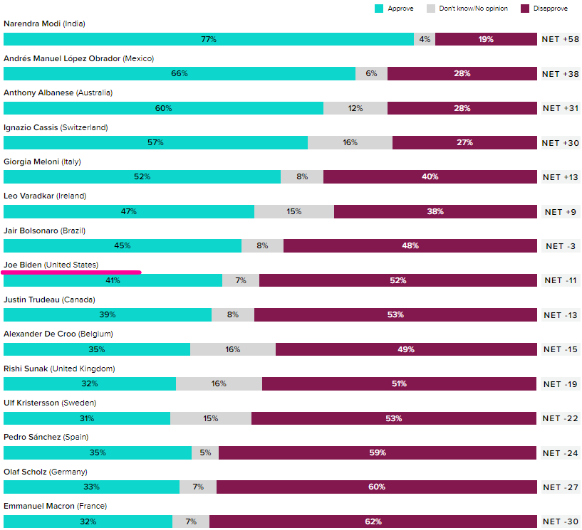 **조 바이든 긍정평가 41% 부정 평가 52%(8위) , 기시다 23%, 부정 평가 64%(20위)