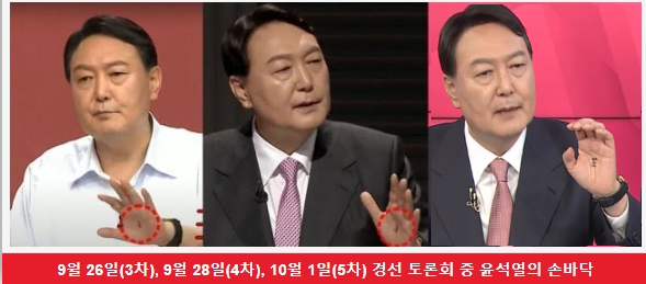 윤석열이 대선 토론 당시 3 회의 당내 대선 토론(2021년 9월 26일(3차), 9월 28일(4차), 10월 1일(5차)에서 손바닥에 임금 왕 자를 손바닥에 써져 있었다.
