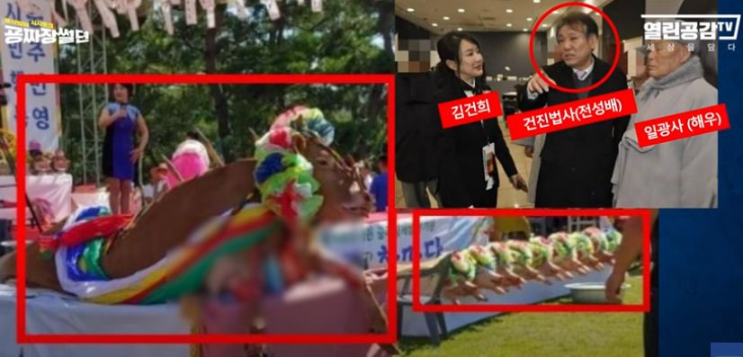 2018년 9월 9일, 일광 조계종 주최하에 충주시에서 살아있는 소의 가죽을 벗겨, 굿을 해서 이슈가 되었다. 이름하여 '2018 수륙대재(국태민안 등불축제)'로, 10 여 마리의 돼지 사채를 무대 앞에 전시해 놓고, 살아있는 소가죽을 벗기는 엽기적인 굿 행사이다. 이 행사에 '코바나 콘텐츠 대표 김건희'라는 이름과, 그 옆으로 '서울 중앙 지방검찰청 검사장 윤석열'이란 이름으로 다소 생소한 형태의 하얀 연등이 달려 있다.