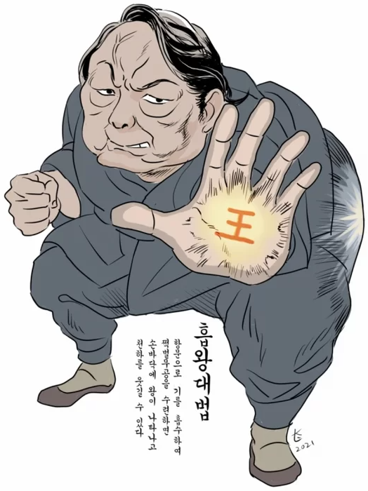 ▶ '흥왕 대법 : 항문으로 기를 흡수해 쩍벌 무공을 수련하면, 손바닥에 왕이 나타나고, 천하를 이길 수 있다'