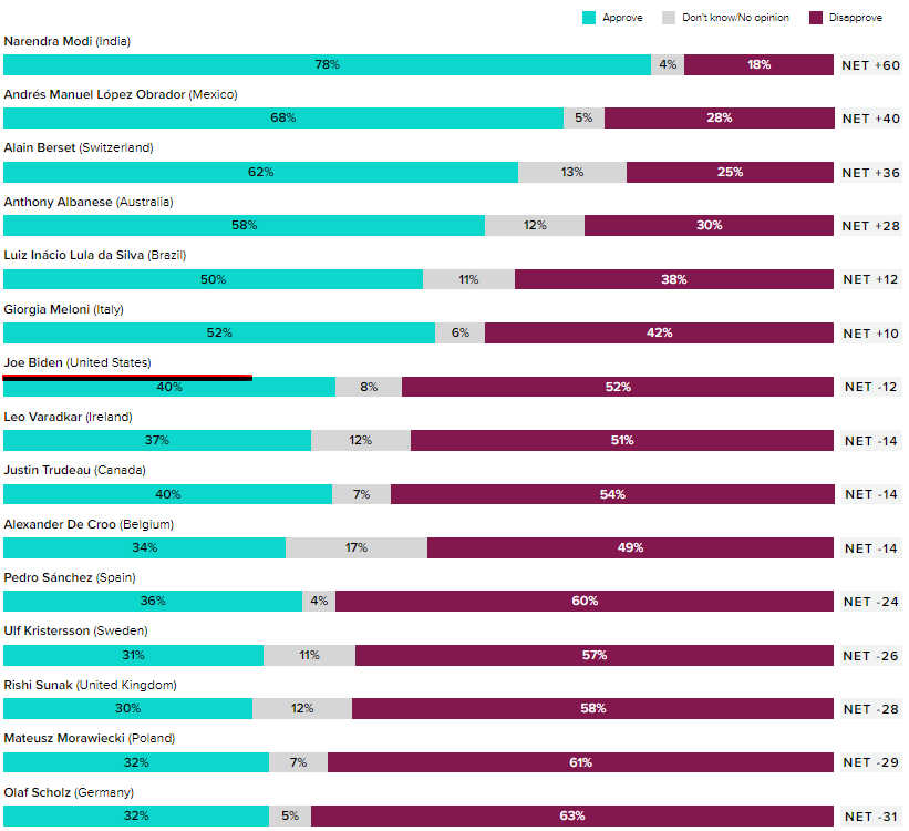 The latest approval ratings are based on data collected from January 26-31, 2023. Approval ratings are based on a seven-day moving average of adult residents in each country, with sample sizes varying by country.