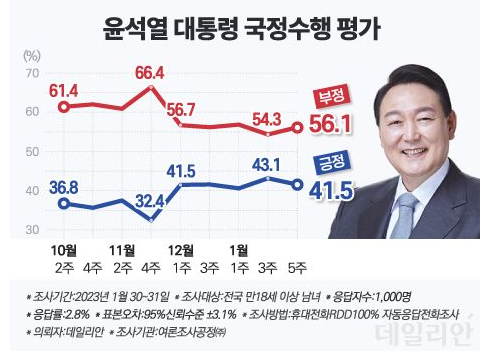 1. 윤 대통령 국정운영평가 : 부정 평가 56.1%, 긍정평가 41.5%