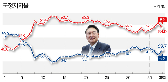 1. 윤석열대통령 지지율 : 긍정 39.7%, 부정 58.0%