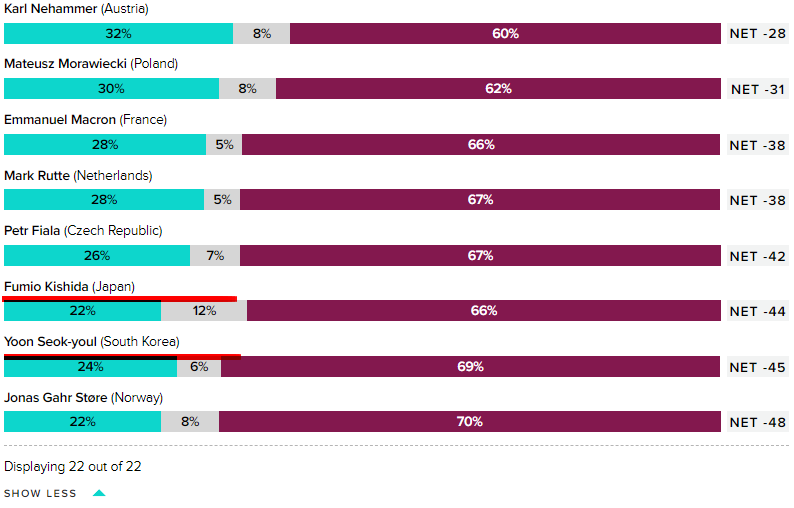 **조 바이든 긍정평가 41% 부정 평가 52%(8위) , 기시다 긍정평가 22% 부정 평가 66%(20위)