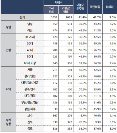 2. 정당지지도 : 민주당 41.4%, 국민의힘 42.7%, 정의당 3.0%