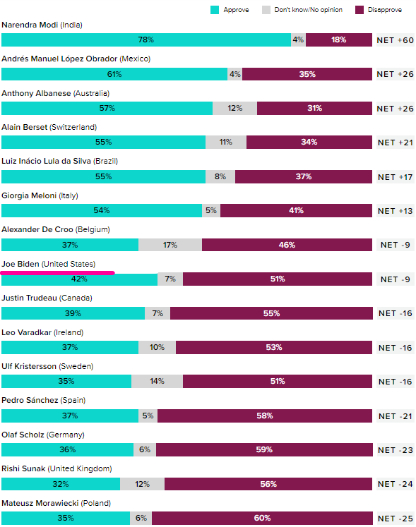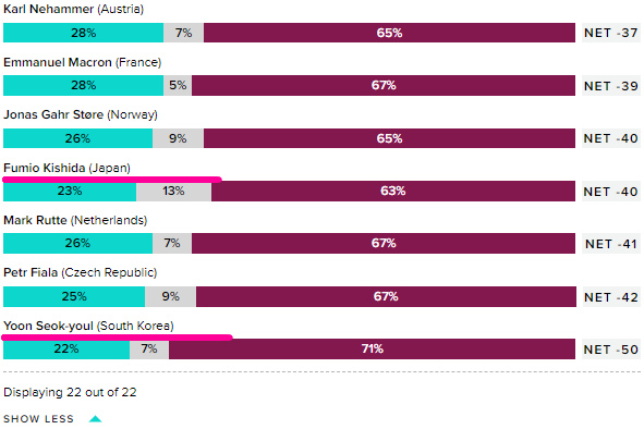 **조 바이든 긍정평가 42% 부정 평가 51%(7위) , 기시다 긍정평가 23% 부정 평가 64%(19위)