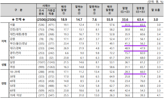 ▲경기·인천 : 긍정 34.0% 대 부정 65.5%,