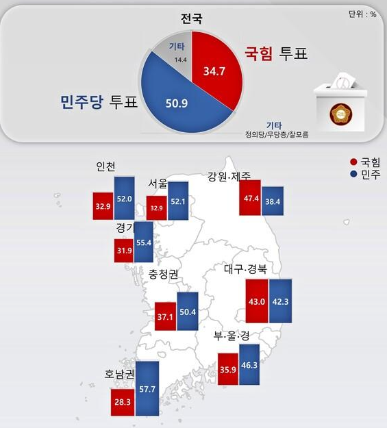 특히 의석이 가장 많은 수도권에서 서울(33.7%, 59.3%), 경기·인천(36.1%, 56.3%)과 같은 결과가 나와 '정부 심판론'이 압도적으로 높음이 확인