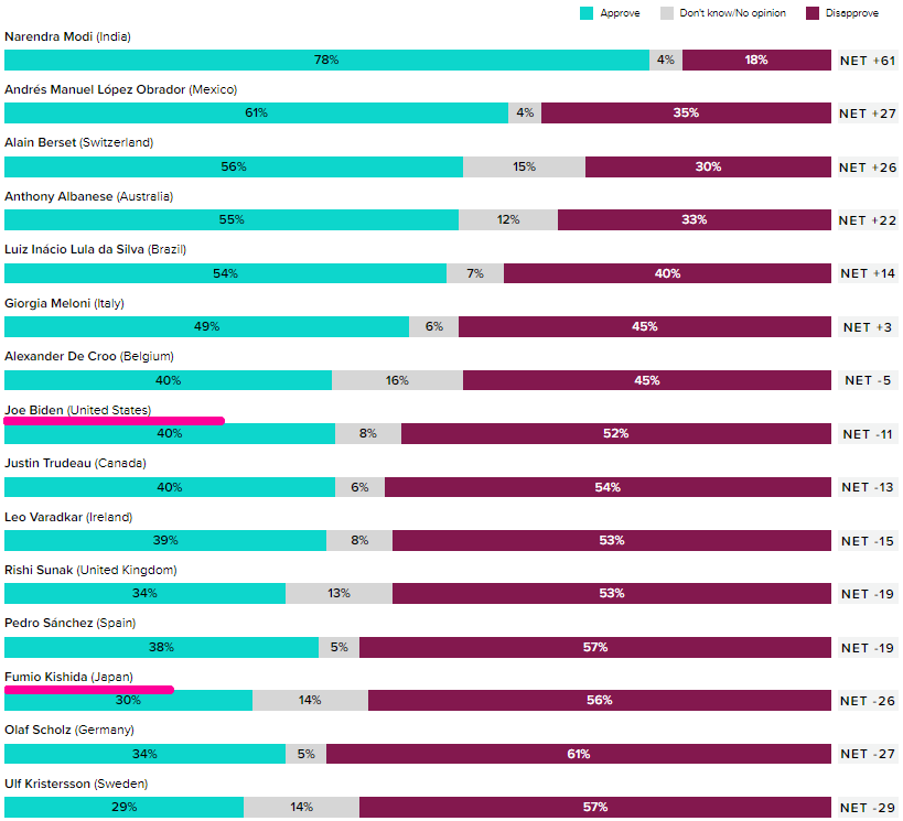 **조 바이든 긍정평가 40% 부정 평가 52%(8위) , 기시다 긍정평가 30% 부정 평가 56%(13위)