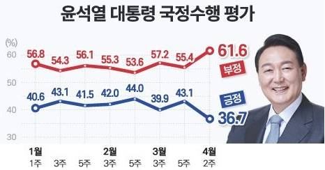 1. 윤석열 대통령 국정수행평가 : 부정 61.6%, 긍정 36.7%