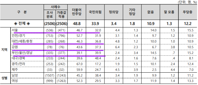 ▲부산·울산·경남(PK) : 국민의힘 40.3% 대 민주당 44.2%