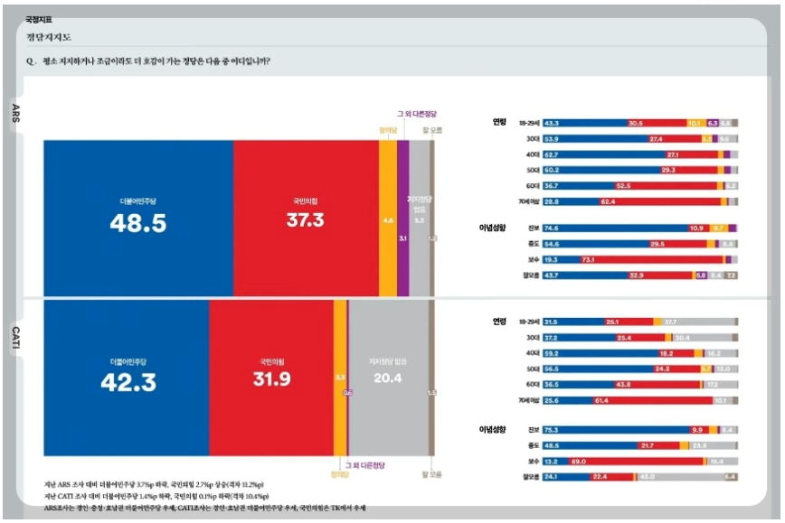2. 정당지지도 : 더불어민주당 48.5%, 국민의힘37.3%(ARS)