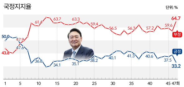 1. 윤석열대통령 지지율 : 긍정 33.2%, 부정 64.7%