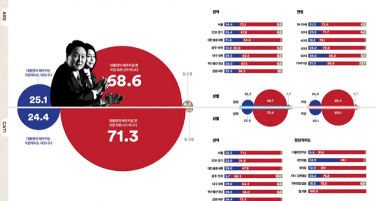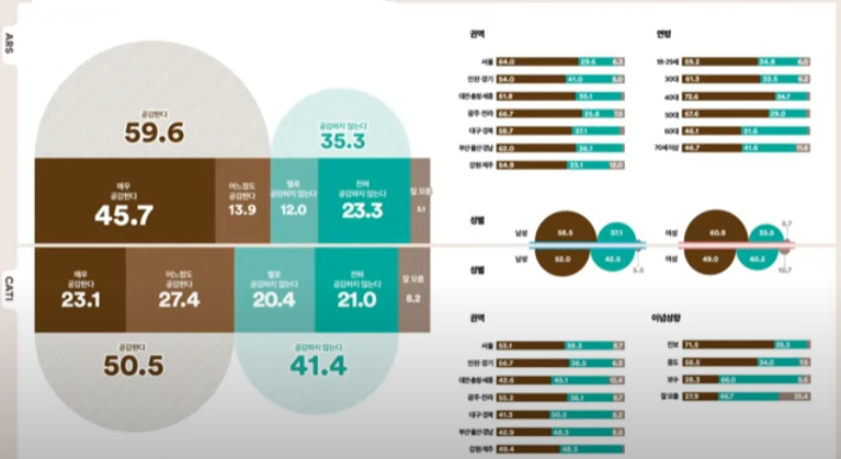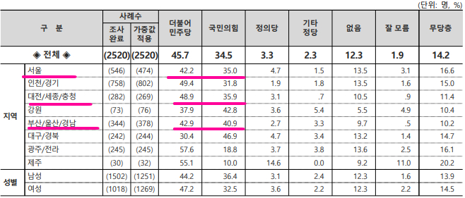 ▲서울(민주 57.1% 대 국힘 31.2%), ▲인천/경기(48.9% 대 37.7%), ▲호남권(58.8% 대 18.7%), ▲충청권(53.9% 대 35.4%), ▲강원/제주(50.5% 대 31.5%) ▲부산/울산/경남(54.5% 대 33.9%) , ▲대구/경북(37.8% 대 53.5%)