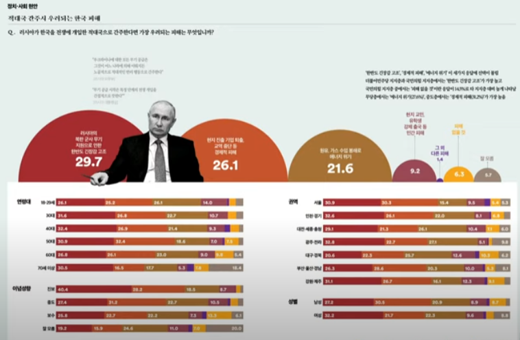 4. 적대국 간주시 우려되는 한국피해? 러시아의 북한군사무기지원으로 한반도긴장고조 29.7%, 현지 진출 기업 퇴출, 교역 중단 등 경제적 피해 26.1%, 원유, 가스 수입봉쇄로 에너지 위기 21.6%