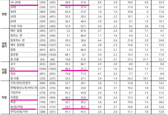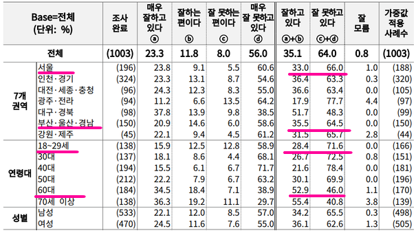 긍정 평가는 60대와 70대 이상에서 부정 평가보다 높게 나타났고, 나머지 연령대는 부정평가가 앞도적으로 높게 나왔으며, 대구·경북(TK) 지역을 제외한 전 지역에서 부정 평가가 역시 높게 나왔다.