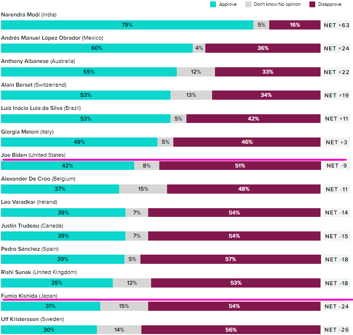**조 바이든 긍정평가 42% 부정 평가 51%(7위) , 기시다 긍정평가 31% 부정 평가 54%(13위)