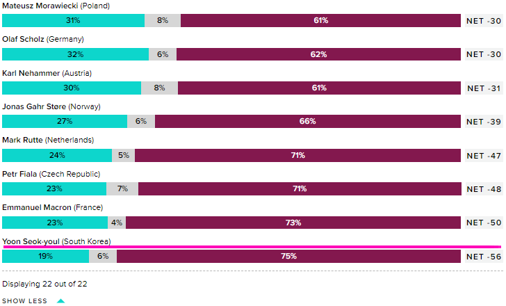1. 윤 대통령 국정운영평가 : 긍정 19%, 부정 75%(22개국 중 22위)