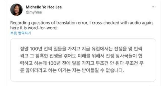▶ 그러면서 “영어로 번역되는 과정에서 있을 수 있는 오역을 가지고 실제 발언은 확인하지도 않은 채 반일 감정을 자극하고 나선 것”이라고 WP의 오역 가능성을 제기