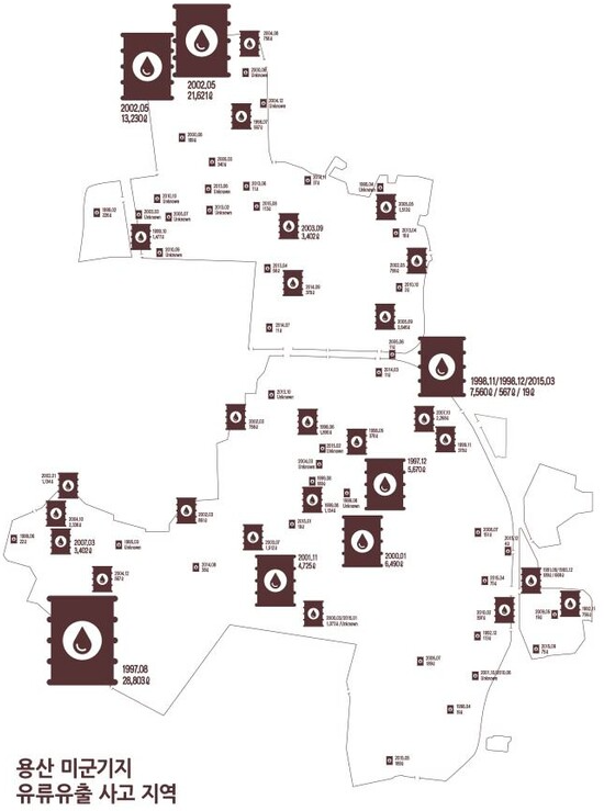 1990년~2015년 용산미군기지에서 84~90건의 기름유출사고 발생(2017년, 미국국방부자료, 녹색연합1)
