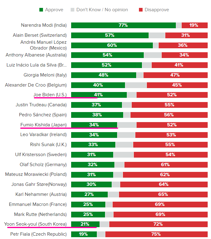 **조 바이든 긍정평가 41% 부정 평가 52%(8위) , 기시다 긍정평가 34% 부정 평가 52%(11위, 3위 up)