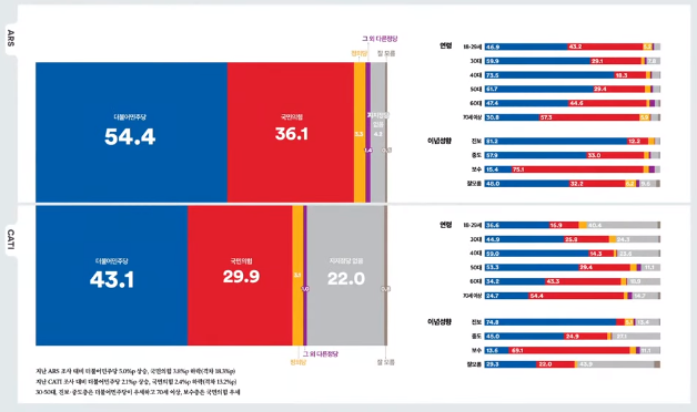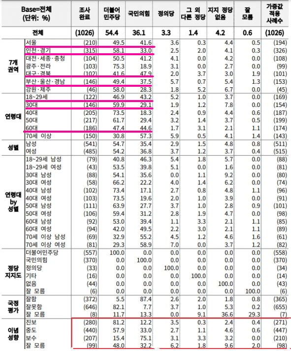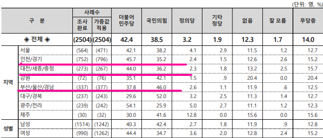 △호남권(50.5%) △충청권(40.9%)은 민주당을 지지하는 경향이 강했다. 반면 국민의힘은 △대구·경북(37.7%) △부산·울산·경남(35.7%)에서 높은 지지를 받았다.