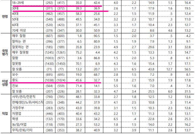 1) 민주당의 20대와 30대 지지율 : 각각 23%, 28%를 기록했는데, 이는 직전 조사(25%, 33%)를 밑도는 수치