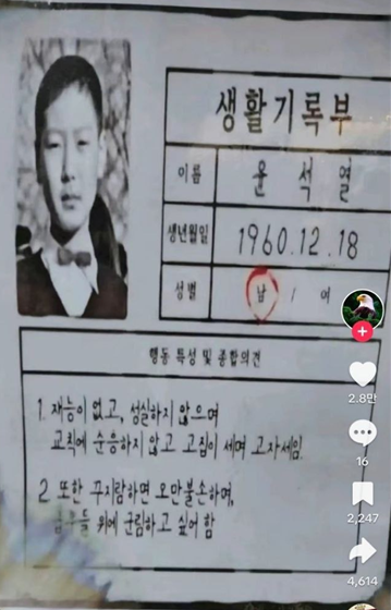 아래의 사진을 보면, 윤석열의 초등학교 생활기록부가 가관이다.