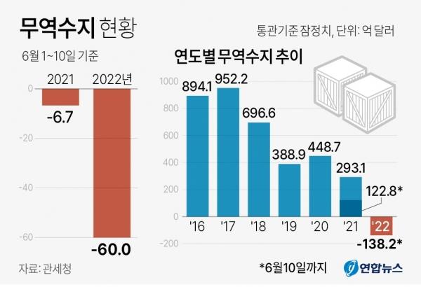 이미, 작년 무역적자가 479억달러(약 60조 원)로 사상 최대 무역수지를 기록했는데, 올해 5개월 동안 271억 달러의 적자까지 합하여 누적 94조원의 적자를 기록.