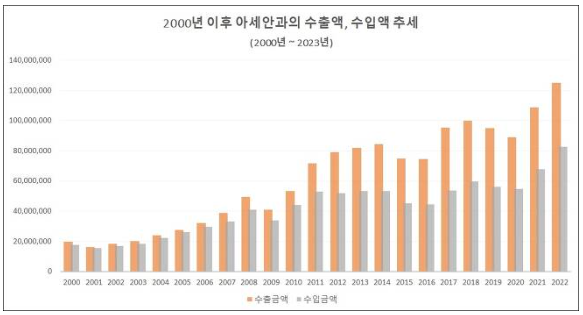 라, 한국-아세안과의 교역규모(22년 2074억달러, 423억불 흑자)