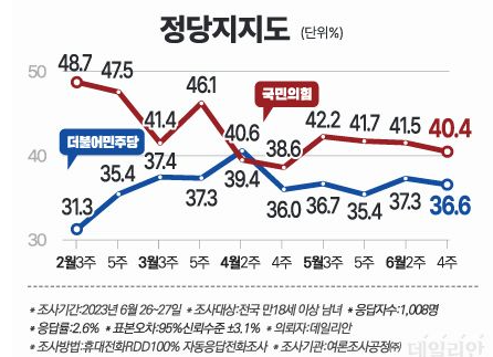 2023.06.26 - [정치] - <6월 4주 여론조사집계> 윤 대통령 지지율 및 정당 지지율 등
