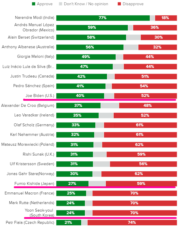 **조 바이든 긍정평가 40% 부정 평가 52%(9위) , 기시다 긍정평가 27% 부정 평가 59%(18위)