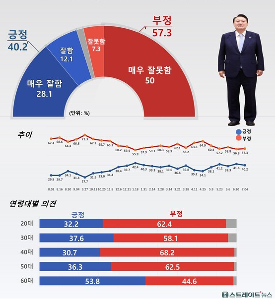 1. 윤대통령 국정평가 : 긍정평가는 40.2%, 부정평가는 57.3%
