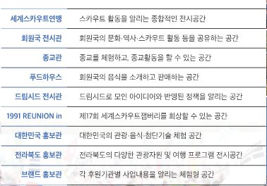 7. 주요 시설 : 세계스카우트연맹전시관, 회원국전시관, 종교관, 드림시드전시관, 전북홍보관, 대한민국홍보관, 잼버리 소방서(7월 31일~8월 12일), 잼버리병원(야영지내 병상 150개), 글로벌청소년리더센터(운영본부), 덩굴터널 57개 동(그늘 장소, 칡, 등나무, 머루, 호박 등 9종류 식물), 물방울 안개 분사시설, 쿨링버스 130대 배치