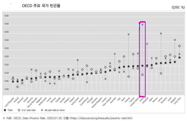 - 한국 노인인구의 상대적 빈곤율(2021년 기준) : 37.6%(OECD 내 최고 수준)