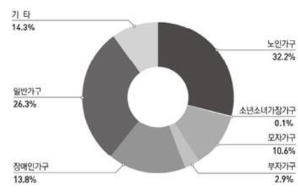 위의 표에서 알 수 있는 바, 한국의 기초생활보장 수급자비율 중 노인가구가 32.2%를 차지(2022년 기준)한다.