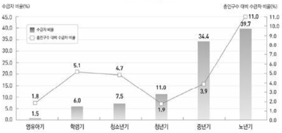 - 총인구수 대비 수급자 비율 : 노년기가 11.0%로 최고(노인인구 9명 중 1명가량이 수급자인 셈)