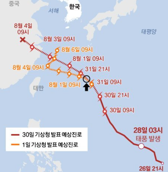 7월 30일 기상청이 발표한 '카눈'의 예상진로