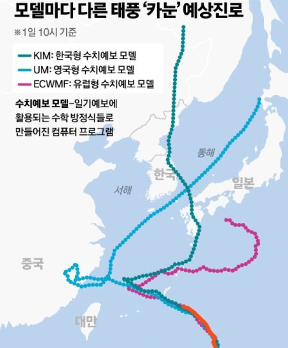 8월 1일까지만 해도, KIM(한국), UM(영국), ECWMF(유럽)의 카눈의 예상진로가 너무 차이가 난다.