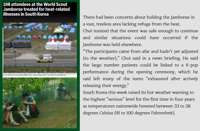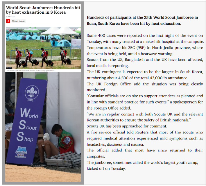 수백 명의 스카우트 대원들이 온열질환에 시달리는데, 이 사실로 화가 난 부모들이 12일간 예정된 행사를 취소해달라는 전화를 하기도 했다. 환자가 속출하면서 SNS에는 아이들을 걱정하는 항의가 빗발치고 있다. 돼체 상황이 어떻게 돌아가는지, 관계부처에 대한 질책, 대회를 끝내라는 요구 등이었다.